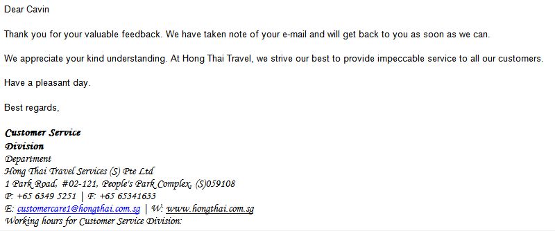 The completed tour survey form was sent to Hong Thai Travel via customercare@hongthai.com.sg on 01 October 2012 and included in the email were detailed feedback about the entire trip.